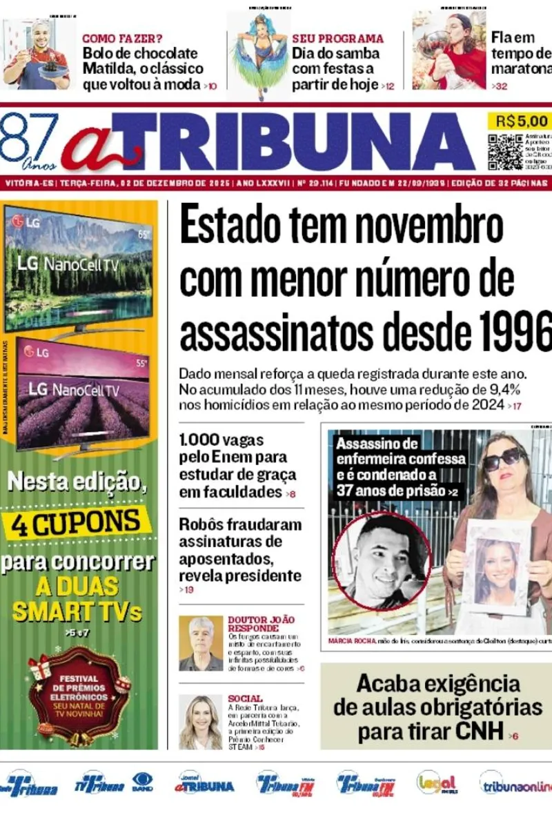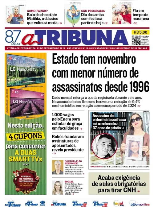 A edição do jornal A Tribuna desta terça-feira, 2 de dezembro, traz em destaque que Estado tem novembro com menor número de assassinatos desde 1996.
