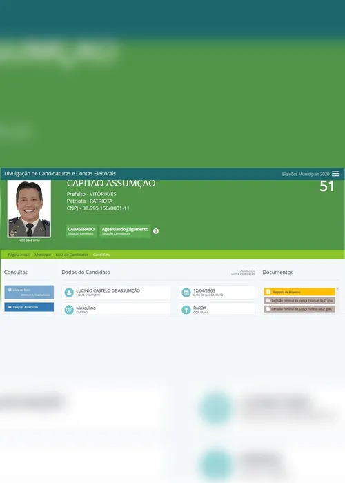 No registro de candidatura a prefeito de Vitória, disponível no site do TSE, a autodeclaração de cor e raça do deputado Capitão Assumção (Patriota) está diferente das declarações feitas em anos eleitorais anteriores. Nesse ano ele se declarou pardo, diferente de 2018 – quando foi eleito deputado estadual – que ele se declarou branco.