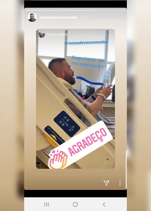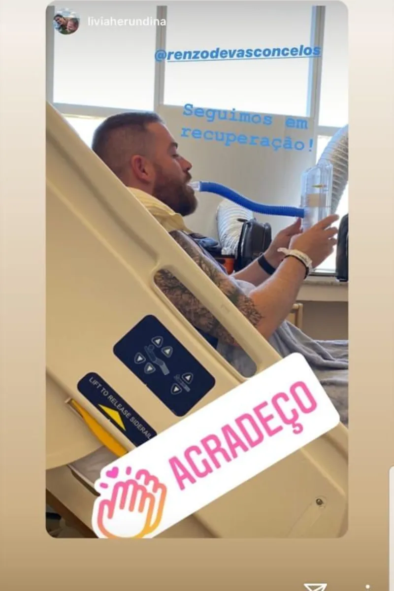 Ontem de manhã, a mulher de Renzo publicou uma foto no stories de seu Instagram com a legenda: “Seguimos em recuperação” e agradecendo. Na postagem, Renzo aparece num leito hospitalar com um aparelho que faz fisioterapia respiratória.