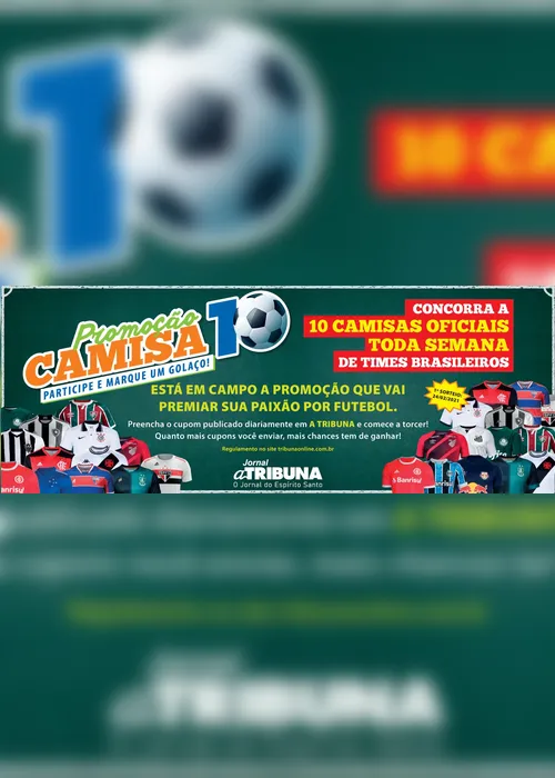 Os apaixonados por futebol têm a chance de ganhar a camisa do time do coração na nova promoção do jornal A Tribuna: Promoção Camisa 10! A cada semana serão sorteadas 10 camisas oficiais de times de futebol brasileiros (que tenham camisa oficial à venda), e o ganhador é quem escolhe o time do seu coração, podendo também escolher o tamanho da camisa. Para concorrer, os interessados devem preencher, com todas as informações solicitadas, o cupom que está sendo publicado no jornal A Tribuna, de terça a domingo, e responder à pergunta “Qual o jornal que dá camisa oficial do seu time do coração?”. Depois, é só colocar na urna instalada na portaria da Rede Tribuna ou em uma das bancas de jornais participantes da promoção. Quanto mais cupons o participante enviar, mais chances tem de ganhar. Importante destacar que só valem cupons originais, recortados do jornal A Tribuna impresso.