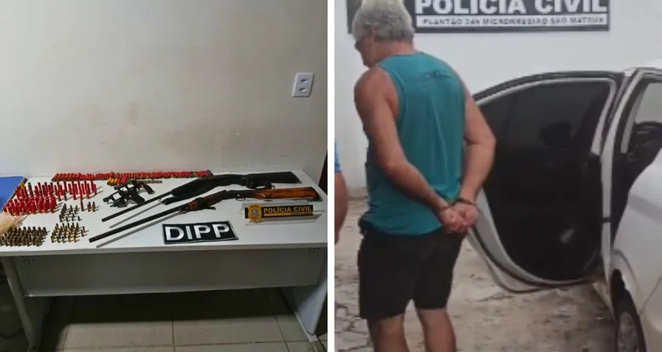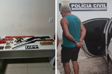 Segundo a Polícia Civil, o suspeito foi encontrado no quintal de uma residência, onde foram apreendidos dois revólveres, duas espingardas e 154 munições de diferentes calibres, incluindo de uso restrito, após ele informar que havia armamento dentro do imóvel.
