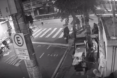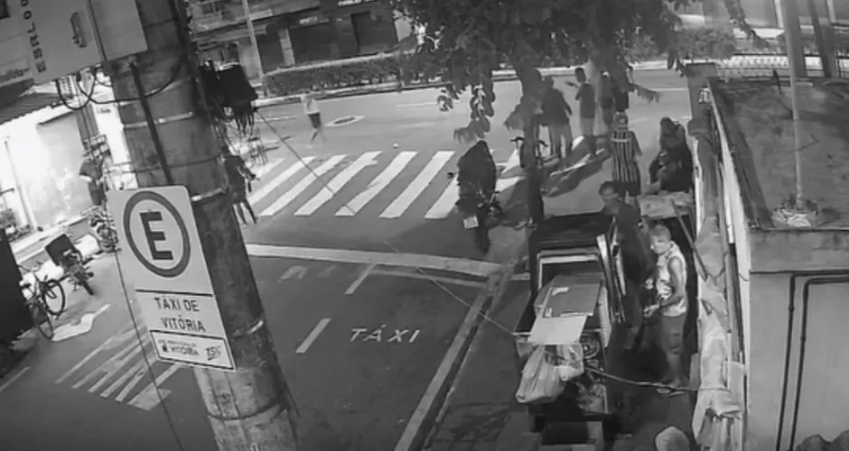 Imagens de uma câmera de videomonitoramento mostram o momento em que um homem se aproxima de um grupo que está reunido em uma calçada e faz disparos contra as vítimas.